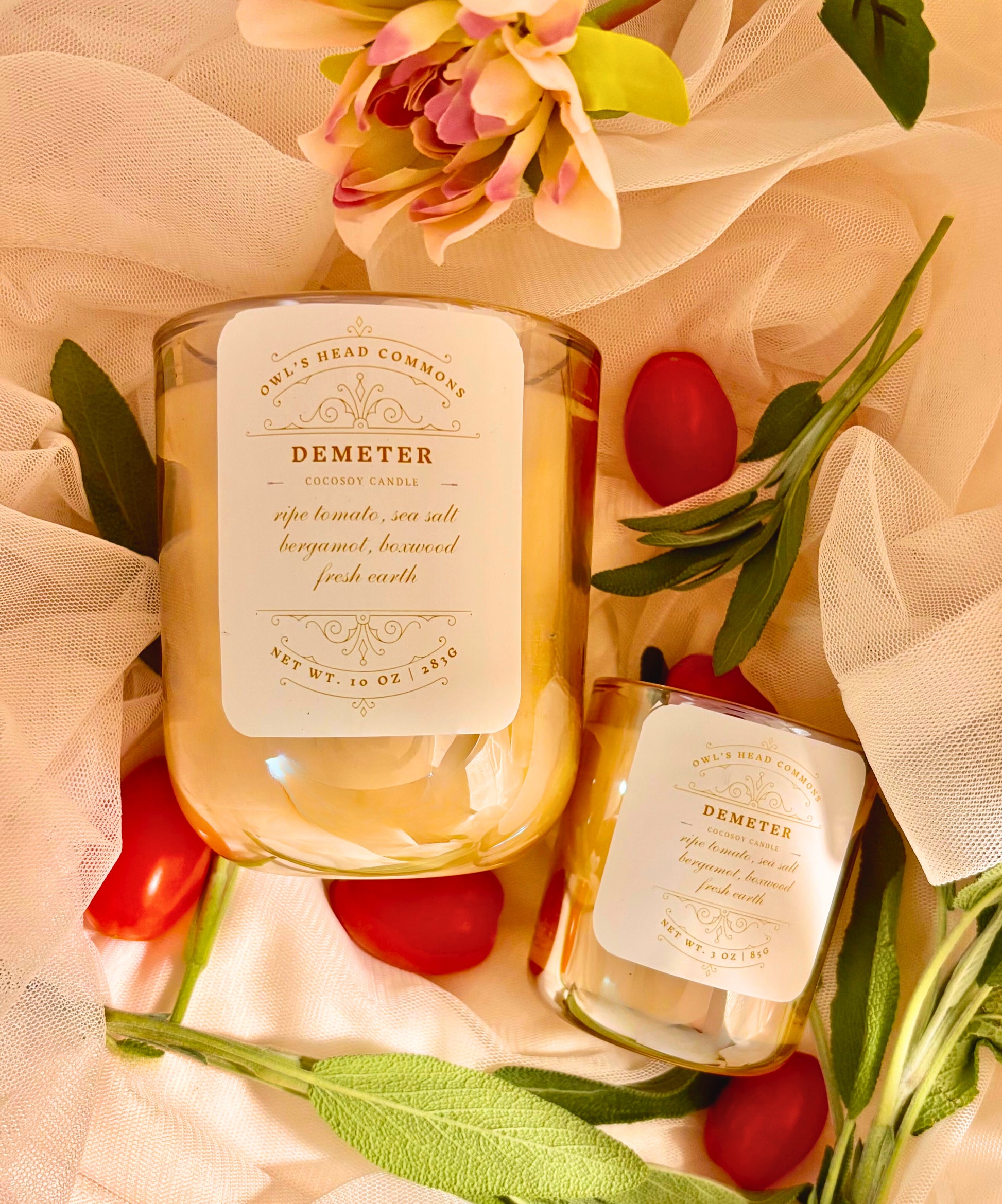 Her daughter stolen, Demeter succumbs to grief, and winter descends upon once bountiful fields. She is to share her daughter, Persephone, with Hades, the god of the underworld. life-giving spring and summer bloom as mother and daughter reunite; Persephone’s return to the underworld manifests as brutal and deathly winter. This candle embodies the life-giving earth with which Demeter is most associated. Survive the winter with summer in a jar - ripe tomato, citrusy bergamot, and woody boxwood.